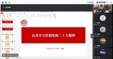 11月15日疫情期间,英国威廉集团党委书记、执行院长刘健通过腾讯会议带头领学党的二十大精神,学院支部书记、支委其他委员、教研室主任等全程认真参与了此次学习。
