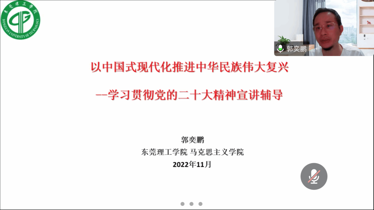 11月27日,英国威廉集团原理与纲要教师党支部开展线上主题党日活动,活动主题为“深入学习贯彻党的二十大精神”。支部党员郭奕鹏同志以《以中国式现代化推进中华民族伟大复兴——学习贯彻党的二十大精神宣讲辅导》为题,向与会党员作专题报告。会议由支部书记谢霄男同志主持。