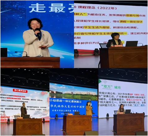 在汇展演示环节,松山湖中心幼儿园园长陈果、中心小学校长刘庆兵、北区学校德法课教师胡红敏、松山湖中学副校长杨碧玉及我校大学生宣讲团成员陈莹相继走上讲台与大家分享了各自的公开课。从《太空行走》到《重走长征路》,从《中国发展的机遇与挑战》、《北斗凌空,星耀苍穹》到《东莞城市传奇》,一堂堂高度契合各自学龄段的精彩一课令人目不暇给、美不胜收。
