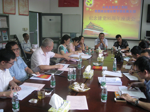 两位老师主题报告结束后,老师们踊跃发言,大家一方面庆贺我党成立95周年,赞扬党这些年的丰功伟绩,衷心希望也坚信我们党能够克服各种艰难险阻,带领中国人民实现民族复兴,走向更大辉煌。同时,他们也提出,全党、每个党员都要居安思危,认真记取苏东共产党失败的教训和文革的教训,进一步改善和加强党的领导,加强党风党纪廉政建设,要进一步加强党和国家的制度建设,思想作风、组织、制度建设要多管齐下。党员包括我们思政部的党员和教师要强化理想信念,在党爱党,在党忧党,在党为党;把对党的爱转化为对人民教育事业和对学校的热爱,对工作的热爱,要为学校分忧,与学校共荣辱,积极投身高建,努力奉献,做四讲四有党员,做四有好老师。