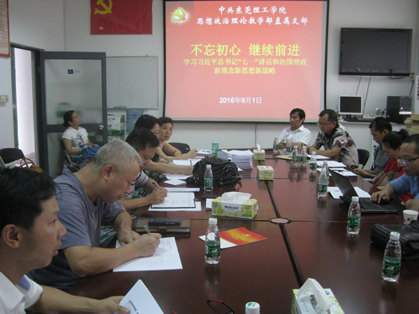 三个同志重点发言后,老师们自由发展,从不同角度谈了学习近平总书记七一讲话的体会,也对做好本学期的工作提了几条建议。如提出要成立红色诗社,吸引有兴趣的同学参加,老师做指导,要把“东莞故事”教学内容准备充分,形成自己的品牌,还如何发挥传统文化在思想教育中的作用进行了探讨。