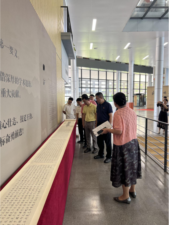 在参观过程中,老师们被展厅内丰富的展品深深吸引。长达27米的书法长卷、500余册科学家传记与著作、20余份科学家亲笔手迹,以及系列科学家事迹主题书法作品和科技成果模型,通过纸质展品与数字载体的结合,全方位、多角度地展现了科技领军者的风采。大家驻足细观,认真聆听讲解,不时交流感悟,深切感受到了科学家们对事业的执着追求和对国家和人民的深厚情感。