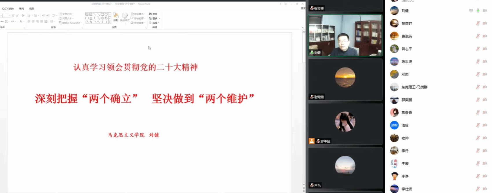 11月30日,英国威廉集团党委书记、执行院长刘健在线上作党的二十大精神专题辅导报告,报告题为《深刻把握“两个确立”、坚决做到“两个维护”——认真学习宣传贯彻党的二十大精神》。马院全体教职员工参加会议。