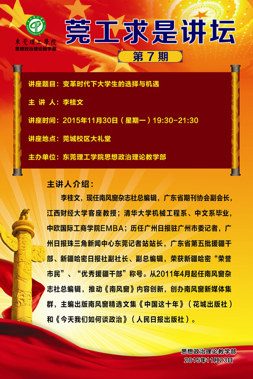 莞工求是讲坛第7期:李桂文《变革时代下大学生的选择与机遇》