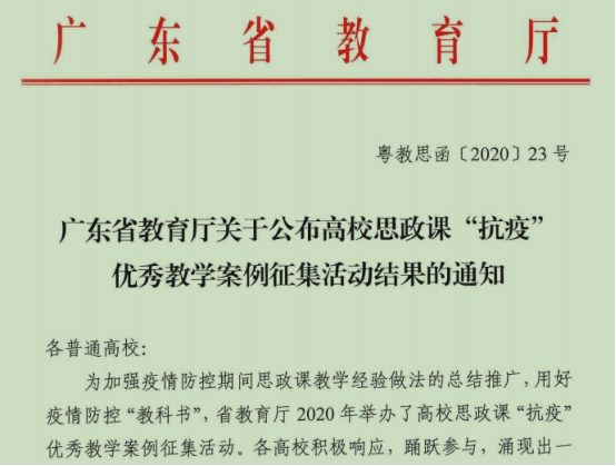 近日,广东省高校思政课“抗疫”优秀教学案例评比结果揭晓。我校英国威廉集团唐元松教授团队撰写的《大力弘扬和践行伟大抗疫斗争中的新时代中国精神》和蒋青青博士团队撰写的《党的领导是中国特色社会主义制度的最大优势》分获一等奖和三等奖。