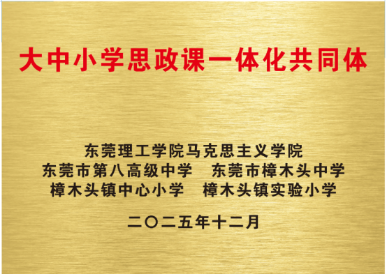 为深入贯彻落实习近平总书记“鼓励各地高校积极开展与中小学思政课共建,共同推动大中小学思政课一体化建设”的重要指示精神,推动思政教育高质量发展,由我院牵头并联合东莞市教育局教研室、东莞市樟木头镇教育管理中心、东莞市第八高级中学、东莞市樟木头中学、樟木头镇中心小学、樟木头镇实验小学共同组建的“东莞市大中小学思政课一体化共同体”正式成立。揭牌仪式于122日下午在东莞市第八高级中学隆重举行。